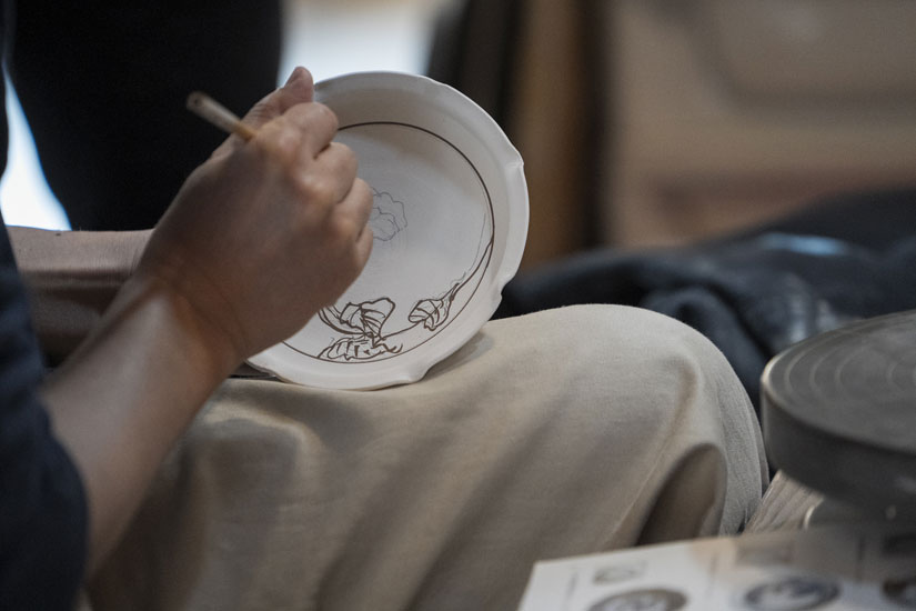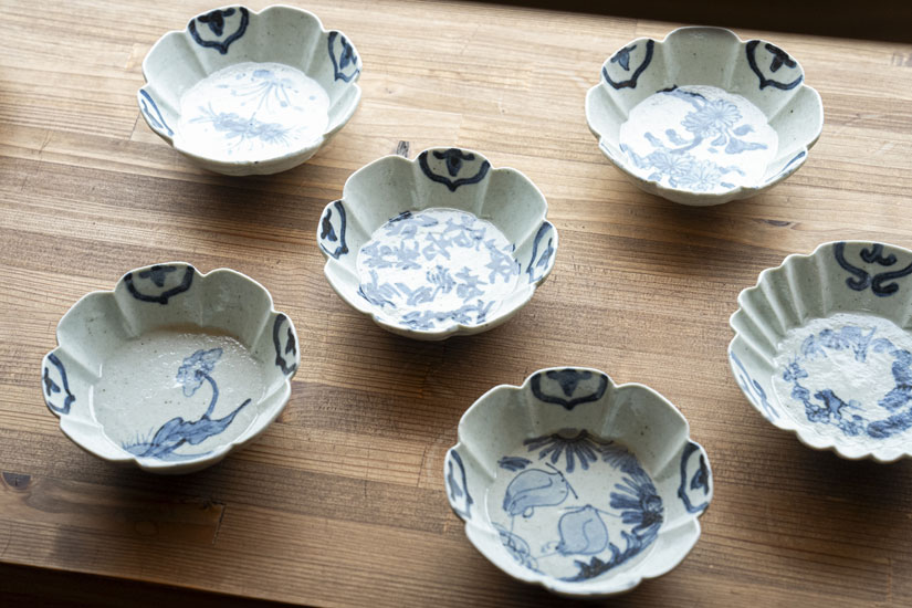しかし絵はあくまで器の一部分。「絵付けにも余白を感じられるよう、ヘタでもいい、はみ出してもいいと線が生きるように描いています」。描かれるのは、桃山時代から江戸時代の初期にかけての古伊万里のような、小紋や菊花、鳥獣などの伝統的な文様だ。筆の勢いにまかせたのびやかな文様は見ているだけで心が躍るよう。