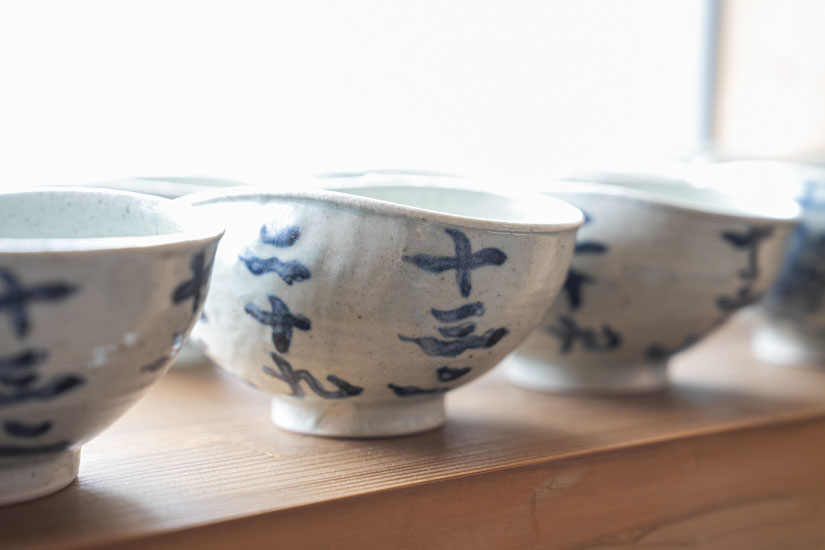 「喜器窯」以外にも、古い焼き物のような器づくりをする窯元はいくつもあるなか、吉田さんが生み出した文様がある。それが素数を漢字でランダムに書く「素数文」だ。「素数は、“割りきれない”ものですよね。そこにわりきれない人の心のような情緒を感じて、昔から素数が好きなんです」と吉田さん。ほかにひらがなの“く”の字を並べたユーモラスな「苦(く)笑文」も人気だ。吉田さんの軽やかな感性は、見慣れたものも新鮮に感じさせてくれる。