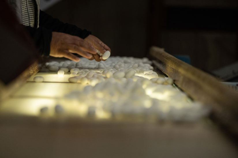 品質の良い生糸を作るため、出庫された繭を選別する作業。2匹の蚕が作った玉繭(たままゆ)、汚れた繭、奇形の繭などを取り除いていく。はじかれた繭も玉糸や絹綿などに加工されるそうだ。ちなみに中のさなぎは肥料や漢方薬などに利用されるらしく「シルクは捨てるところがない」とのこと。