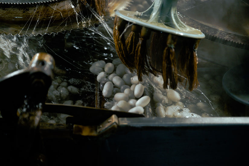 煮繭から糸口を取り出し、目的の太さになるように数本の糸を撚り合わせていく作業。これこそが製糸工場の核ともいえる工程だ。繭はお湯の中でゆらゆらと運ばれながら、小さなホウキでかき出され、もつれた糸から目に見えないほど繊細な1本を引き出し、自動繰糸機にセットされる。生糸が細くなると繊度を感知し、自動的に繭が追加され、生糸は一定の太さで繰り続けられる。糸が切れた時は、職員が手作業で手際よくつなぎ直す。