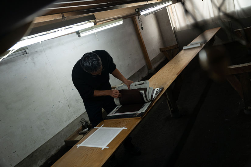 藍田染工には正雄氏が育て守った、貴重な伊勢型紙が多数残っている。使えば摩耗して耐久性が劣化し、いつかは切れて使えなくなってしまう。愛郎さんは江戸小紋を染める際、型紙に負担がかからないよう細心の注意を払いながら、自分の腕を信じて作品作りを行なっている。
