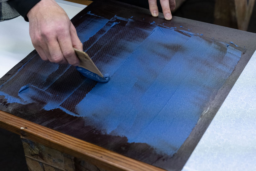 江戸小紋は一反の布を染めるのに、ひとつの型紙を70〜90回繰り返し使って染めるため、地道で緻密な技術が必要とされる。それと同時に、これだけの使用回数に耐えられる型紙でなければならず、縞が潰れず、ムラなくきれいに糊が付けられることが大事なポイントとなる。
