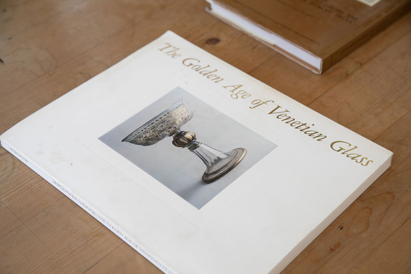 三浦さんは、古書市などで集めた古いガラス器に関する書物を夜な夜な眺め、制作のモチベーションにしている。「例えば16世紀のベネチアングラスなど、写真であってもずっと見ていると当時の職人が頑張って作ってきたんだなって感動するんです。道具の跡など作業の痕跡を見つけたりしながら、どんなふうに作っていたかを自分なりに考えてみるのが楽しくて」