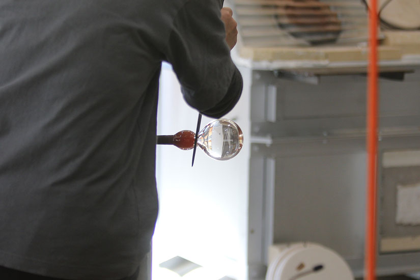 吹きガラスは、高温溶融したガラスを「吹き竿」となる鉄管に巻き取り、空気を吹き込んで風船のように膨らませて成形する。型にはめ込んで成形するよりも薄いガラスを作ることが可能で、その技法は古代ローマ時代からほとんど変わっていないといわれる。
