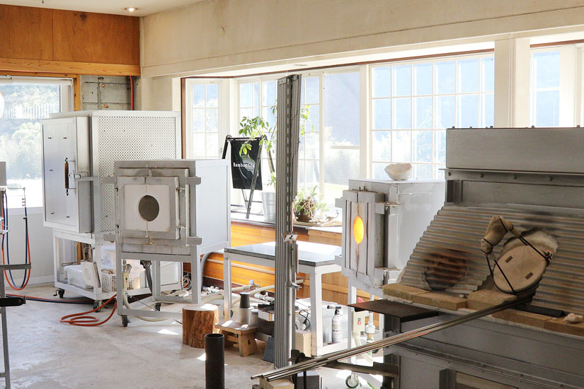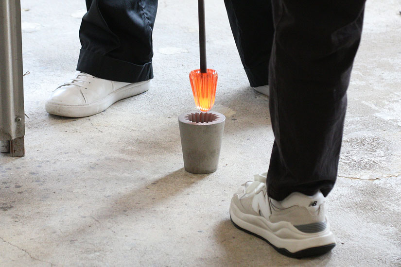 現在は住まいの一角に工房を構え、ひとりで制作している。工房には作る器のサイズに合わせて自作した2つの炉が並ぶ。作業用の炉の温度は約1000℃。ガラスを溶かして貯めておく炉の作業中の温度は約1180℃。こちらはガラスの気泡などを除去するため24時間稼働させ、翌朝すぐに作業できる状態にしている。ふたつの炉が発する熱に包まれながら、コップであれば朝から晩まで20〜30個を作り続ける。「同じことをひたすら毎日、繰り返しても飽きない。それが不思議です。同じものを作っているつもりなのに出来上がったものは一つひとつがどこか違う。だからでしょうか」