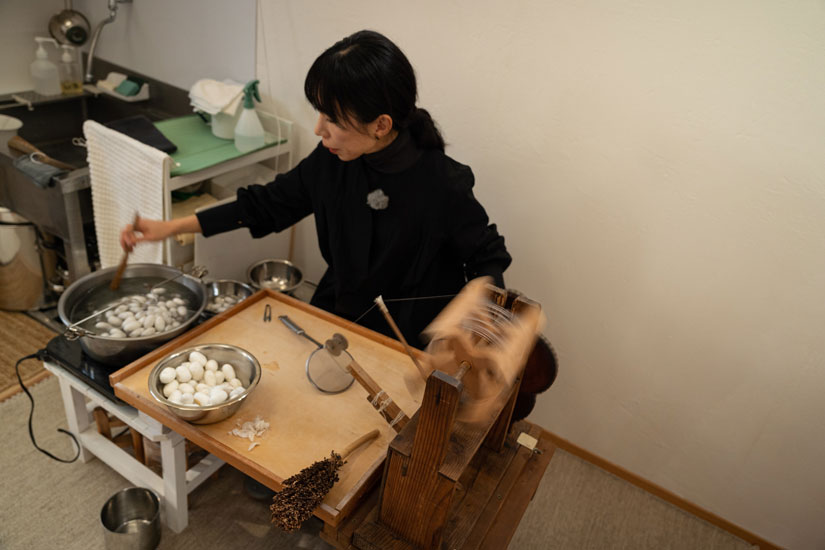 着物、帯、スカーフなど、布製品には適した生地の厚さがある。つくるものをイメージし、生地の厚さに合わせて繭からそのまま糸を巻き取っていく工程は、まさに職人技だ。