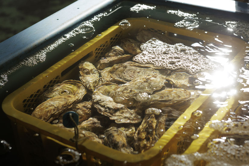 身を大きく育てるための工夫はほかにもある。稚貝のときの「間引き作業」と、夏に船上で75℃の湯に30秒ほどくぐらせる「温湯処理」だ。間引くことで、残った牡蠣は海中の栄養をたっぷり摂取することができるし、温湯処理によって殻に付いたワカメやフジツボなどの付着物を取り除くこともできる。これによって、殻に付着したワカメやフジツボが、牡蠣の成長に必要な海中の栄養を奪ってしまうのを防ぐのだ。
