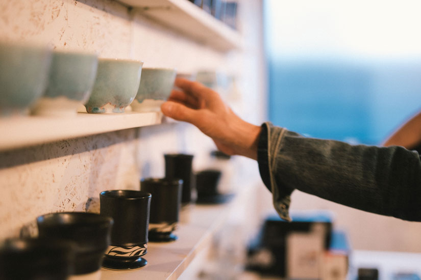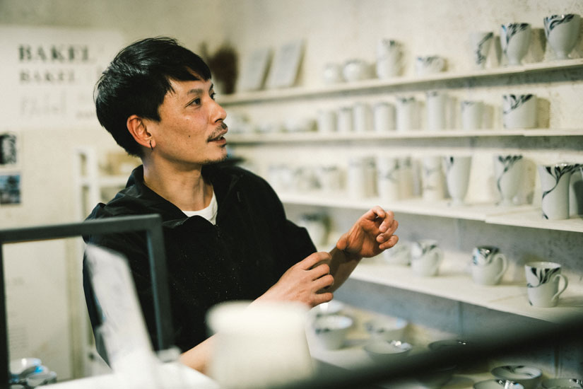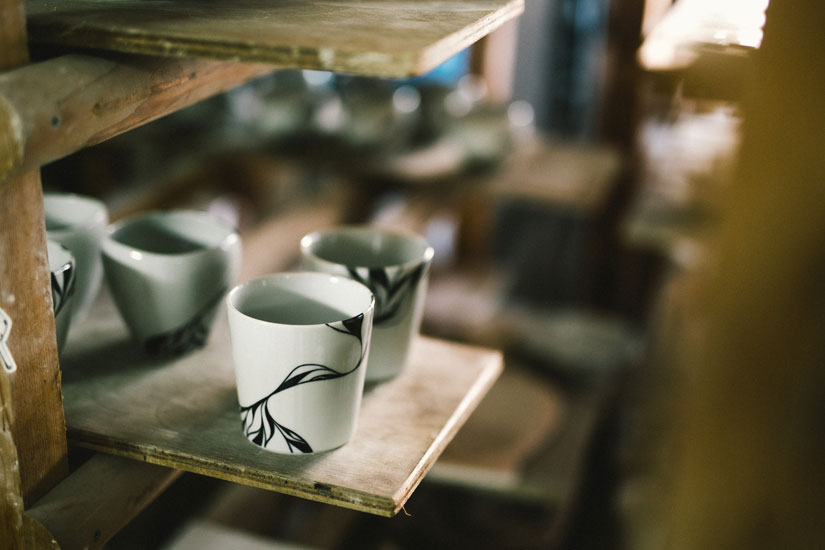色使いにも特徴がある。白磁に藍色や青色の印象が強い砥部焼だが、山本さんのエチュード模様は、黒色の発色が強い黒呉須(ごす)で統一。これにより現代的で引き締まった表情を生み出す。また釉薬は薄めにかけて仕上げる。ずっしりと重みがある砥部焼の印象と異なり、「手にとって使う道具として、なるべく軽く仕上げたい」という実用的な狙いと、山本さんのデザインの特徴である白と黒の境界線をくっきりと見せる効果がある。