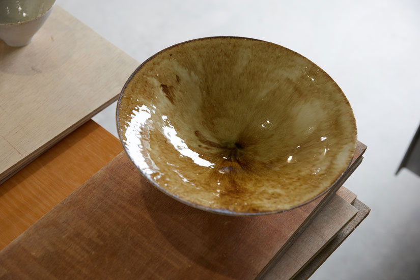 土の配合や釉薬の種類、その濃さや厚み、何度も失敗を繰り返しながら、それぞれの配合を試行錯誤。釉薬を器の内側だけに施す手法をベースにしながら、田代さんの理想の器のフォルムや質感を追求していった。内側だけ釉を施すことで形状を保ち、外側は柔らかな土の質感としている。微調整を重ねながら、現在では外側に刷毛で土を塗り、内側にはコンプレッサーで釉薬を付け足すなど行いながら、田代さんが思い描く「表情豊かな質感」を生み出している。