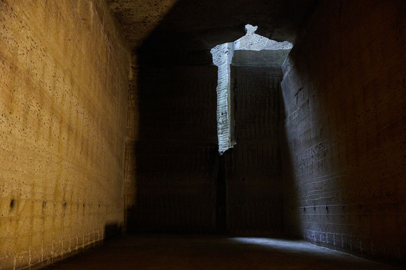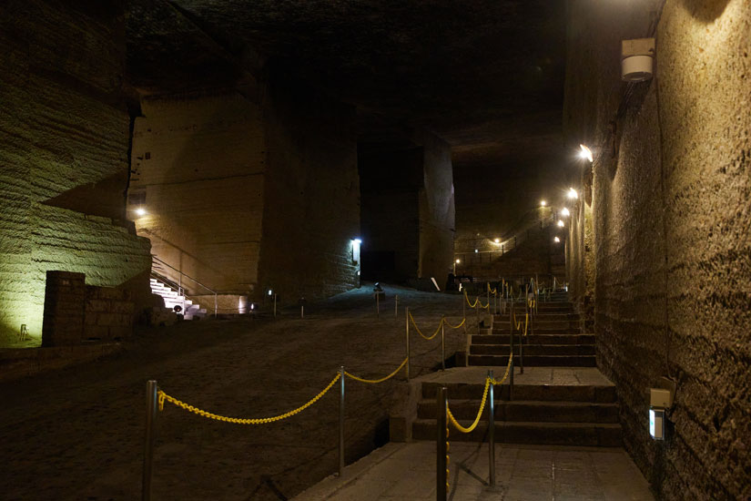 地下30m、広さ2万㎡にもなる巨大な地下の採掘場跡は、徒歩で見学ができる。その内部は真夏でも寒さを感じるくらいヒンヤリと涼しく、年間の平均気温は8℃前後。高くそびえる岩肌には、いくつもの細かい線のようなものが刻まれており、これが石を切り出した跡なのだという。