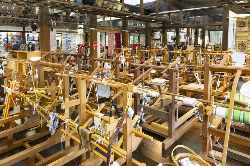 また「より多くの方々に南部裂織を知ってもらいたい」との想いから、何年にもわたって十和田市に掛け合い、2002年道の駅「とわだぴあ」の隣に十和田市の施設として、匠工房「南部裂織の里」のオープンにこぎつけた。75台ほどの地機がずらりと並ぶさまは壮観で、そのほとんどは菅野さんが集めたもの。「十和田市内・南部地方はもちろん、情報を聞きつけては福島県などを訪ね歩いて集めた機もあるようです」と、愛おしそうに地機を眺めながら小林さんは教えてくれた。