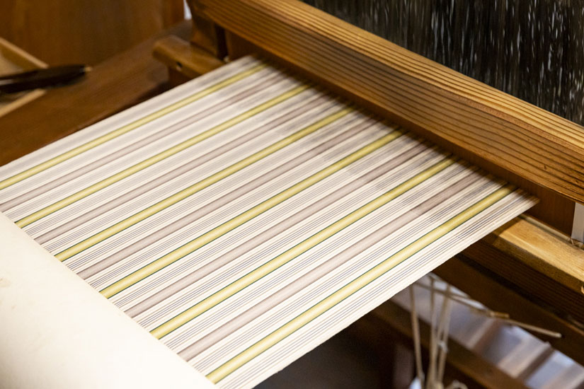 小倉織は経糸(たていと)と緯糸(よこいと)を1本ずつ交差させていくシンプルな織物。しかし、経糸を多く使い緯糸の約3倍の密度があるのが特長だ。そのため緯糸が見えにくく、たて縞が鮮明にあらわれ、見る人を惹きつける美しさを放つ。糸の色の濃淡で立体感を生み出した、なめらかな風合いの唯一無二の織物だ。