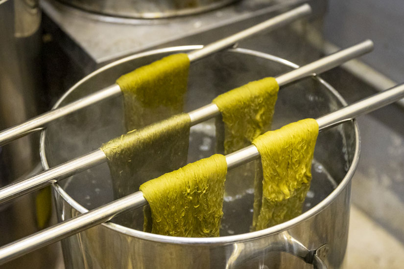 工房周辺の草木など、自然のもので木綿糸を染める築城さん。「草木で染めるのはとても面白いんです。例えばローズマリーだと、花が咲く前は黄みがかった色に染まり、花が咲くとオリーブ味が強く染まる。同じ植物でも、時期によって色が変わるんですよ」。