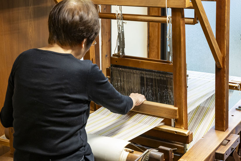 築城さんが織り機で小倉織を織る時、「トントン」という軽やかな音ではなく、「ガンガン!」と大きな音が鳴り響く。繊細な美しさの織物からは、ちょっと想像できないような激しい音だ。「糸の密度を高めるために強い力を入れて織っていきます。やさしく織ると生地がふわふわになって締まりがないし、気を抜くと織りのムラが目立ってくるので、織り始めるととにかくもくもくと集中して進めます」。