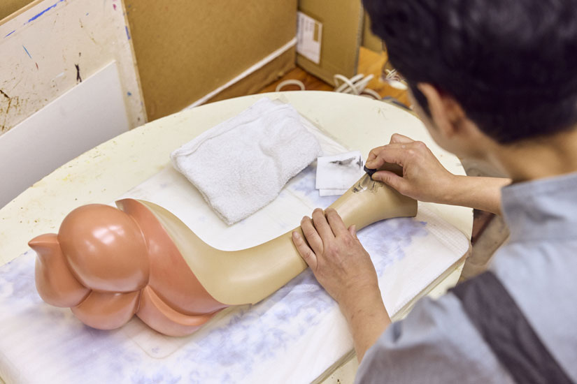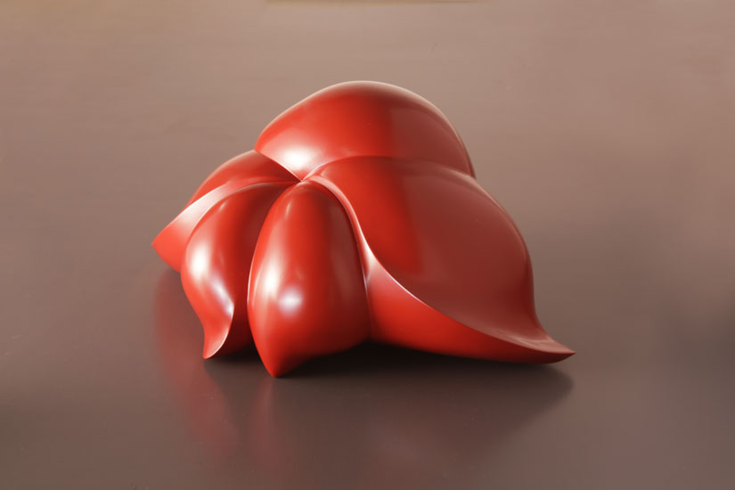 笹井さんが手がける漆の立体作品は、一度塗っただけで完成するものではない。漆を塗り重ね、そのたびに研ぎを入れることで、わずかな凹凸を整えながらムラなく均一な塗り面をつくっていく。さらに漆は温度と湿度を管理した空間でしか硬化しないため、乾燥を待つ時間も必要だ。その反復が何度も積み重なって、初めてこのなめらかな質感や柔らかなフォルムが立ち上がってくる。