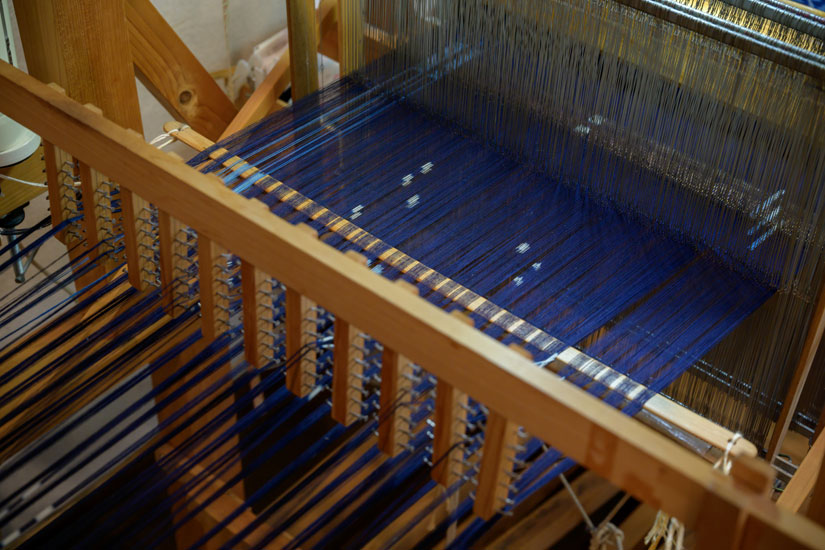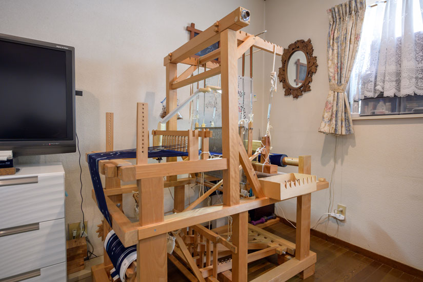 そしてリビングに置かれた機織り機で織り進める。驚くことに、その機織り機はご夫妻で手作りしたもの。伊予絣会館にあった機織り機を詳しく観察し、村上さんが設計図を描き、ご主人が村上さんの身長に合わせて製作したという。