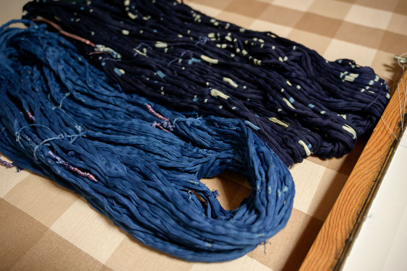 村上さんは工房を持たず、自宅で全工程を一人で手がけている。機織りの作業は全体の2〜3割程度で、ほとんどの時間を染色や糸の準備に費やす。自室ではデザインを考案し、ガレージでは発酵させた藍を使って染色を行う。湿度や温度、そして染液の酸性・アルカリ性を示すpHを測定しながら、藍を最適な状態に保つのも重要な仕事だ。染色は40回ほど繰り返され、仕上がりまでに約1ヶ月を要する。その後、時間をかけて糸を解き、成形していく。