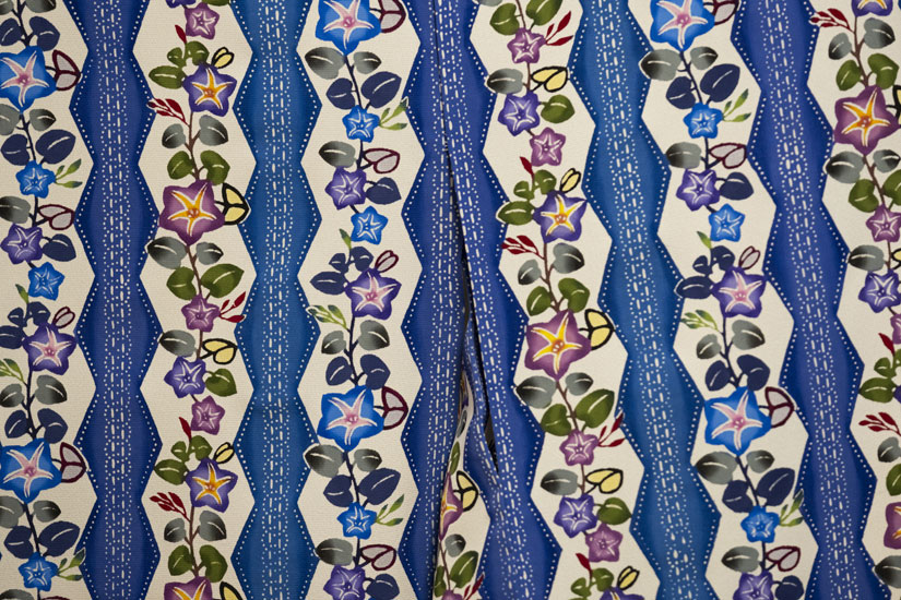 藍色がきれいなこの図柄は「アメフィーバナ」。沖縄の言葉で雨降り花の意味で、ノアサガオが描かれている。地の青の部分は琉球藍で染められている。琉球藍は本土の藍よりも、青みが強く深みがあるという特徴を持つ。