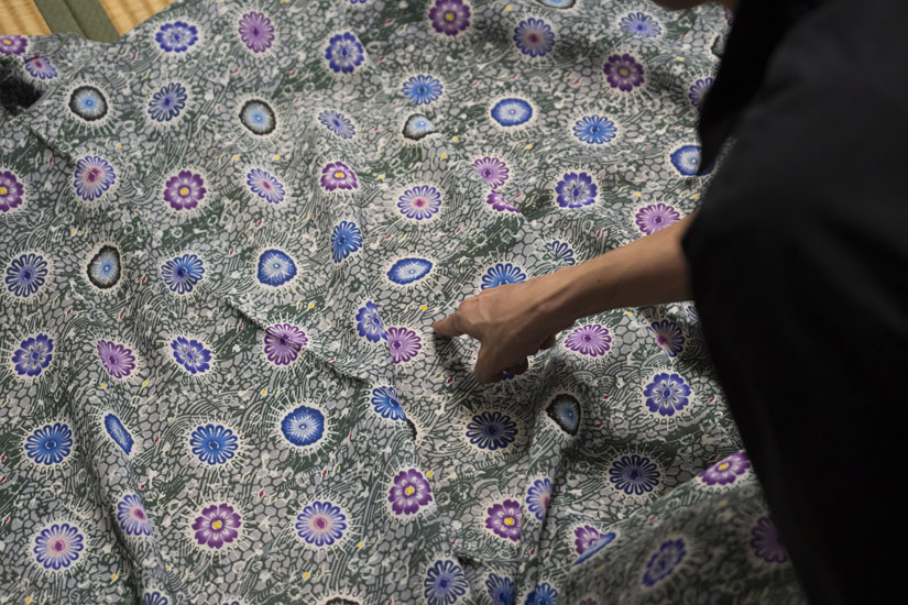 「花降る島」と名付けられたこちらの着物は、異なる図柄の型紙を2枚重ねて染める朧型という技法で作られている。2倍の手間がかかり、高い技術が求められるので、手をつける人は多くはないのだそう。労力はかかるけれど、知念さんはこの朧型が好きで度々手がけるのだそう。この生地は近くの南風原町で作られた、シルクの薄い生地である壁上布が用いられている。