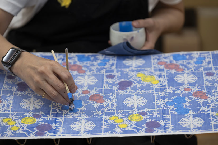 細かい色をのせていく「色差し」は2本の筆を同時に持って行う。つけ筆で顔料をのせていき、刷り筆で粒子の粗い顔料を生地に浸透しやすくするために刷り込んでいく。その次の工程では、模様のイメージを強調させるために、さらに色を差しながら筆でぼかしを入れ、ここでも立体感を出していく。