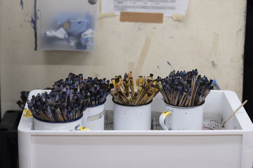 筆も、幾種類もあり、生地によって使うものを変える。道具は手作りのものも多い。