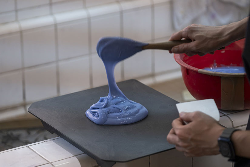 もち米やぬかで手作りする防染糊には青い顔料を混ぜている。そうすることによって、後の地染めの時の発色がよくなるのだそうだ。