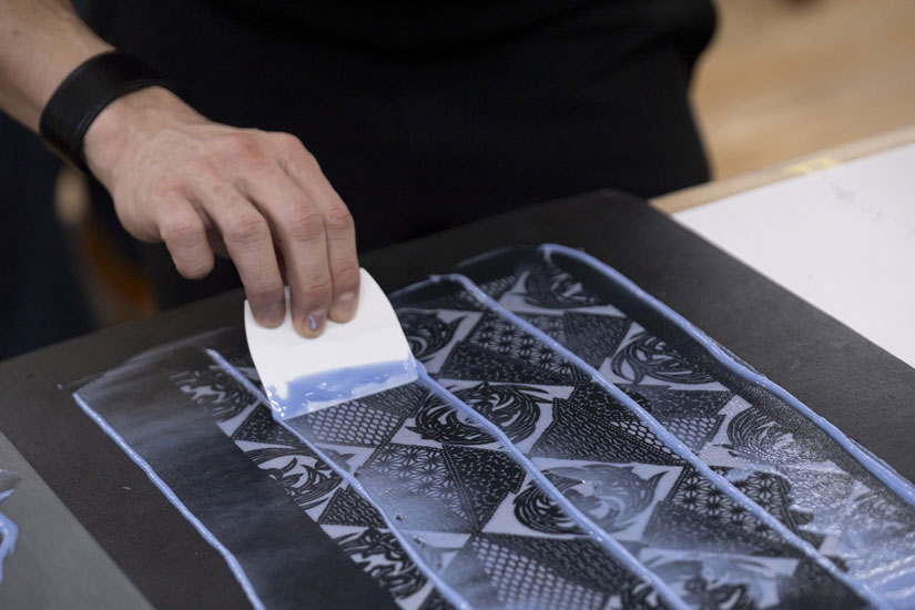型置きという、型紙を置き、防染糊をヘラで塗っていく作業を行う。糊でマスキングし、この後に染める染料の色が染まらないようにするためだ。糊をすくい、均等にのばし、そっと型紙をはがし、柄がきちんとつながるように隣に型紙を置く。スピードが遅いと、すぐそばから乾燥して目詰まりしたり、紙を剥がすと穴だらけになってしまったりするのだそう。知念さんの所作は、流れるようになめらか。この作業は、沖縄に戻ってきた年は1日に生地1本しかできなかったのが、今では1日に15本もできるのだとか。