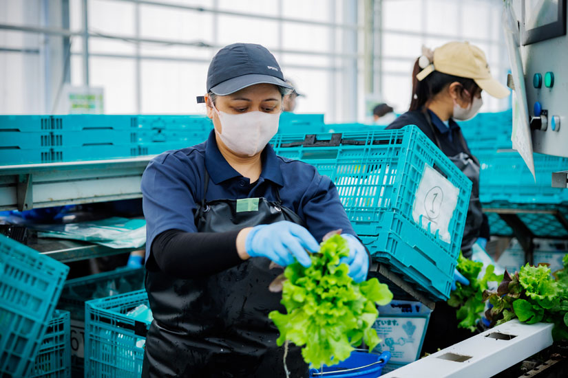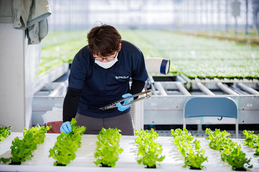 その中核を担うのが、仙台市から北へ約60km、遠田郡美里町に構える次世代型植物工場「美里グリーンベース」。奥行500メートルに及ぶ大規模ハウスで水耕栽培を行い、天候や季節に左右されることなく、一日約4万株のリーフレタスを出荷している。リーフレタスは植物工場での自動化や周年栽培との相性がよく、品質の安定と高効率生産を両立しやすい作物。生産効率は露地栽培のおよそ80倍にのぼるという。国内外の事例を調べながら、舞台ファーム独自の運営モデルを構築したのだ。