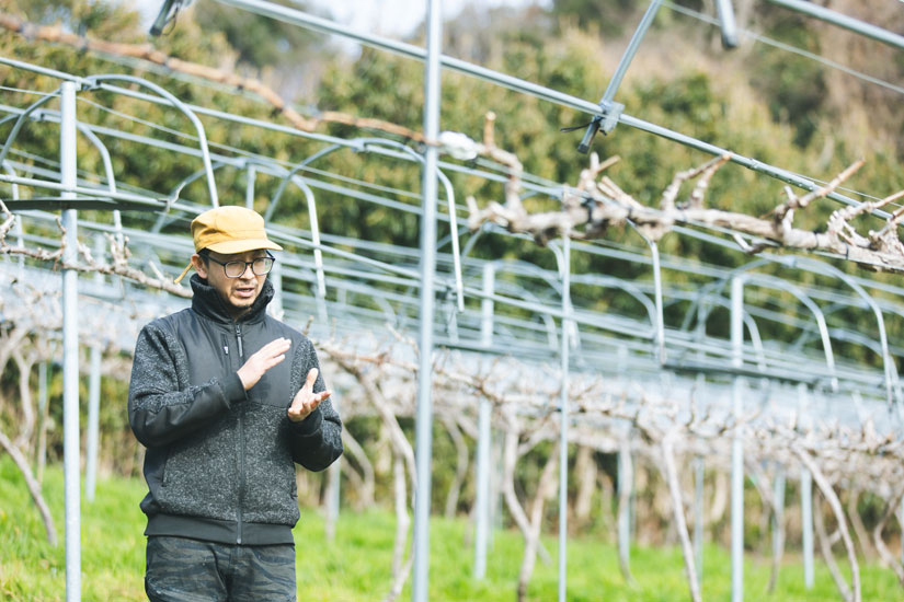 「瀬戸内の風景は本当に素晴らしい。僕が生まれ育った静岡にも良く似ていて、海が近くて気持ちが良くて、住んでいる人もやさしい。ここでぶどうを育ててワインを造ってみたいと思ったんです」。川田さんは2015年に単身で大三島に移住してきて、島の課題にもなっていた耕作放棄地を借りて苗木を植え、ぶどうの栽培を開始した。