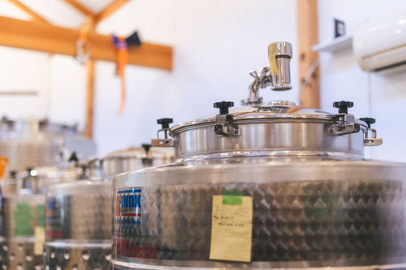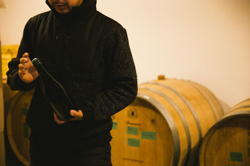 設計上さまざまな制限があるなかで、醸造所には川田さんが今まで学んできたことを注ぎ込み、できる限りのこだわりを実現した。高低差を利用してタンクや熟成容器に原材料を移動させるグラビティ・フローシステムもそのひとつだ。ポンプを使うより負担が少ないため、ぶどう本来の味を引き出せるのだという。タンクもホーロー、樹脂、コンクリートなど、それぞれメリット・デメリットを吟味した上で、最終的にスロベニア製のオーダーステンレスタンクを採用した。フレンチオークの樽も5年物と3年物を導入。新しい樽は木の香りが強く出る一方、使い込むほどに香味は穏やかになり、ワインとの調和が深まっていく。年数ごとの個性を見極めながら使い分けるのも、川田さんのこだわりのひとつだ。