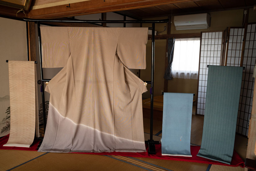 In 2025, when fewer people wear kimonos on a daily basis, Mr. Airou wants to create items that go well with both Japanese and Western clothing, and he is taking on new challenges, such as dyeing an organdie stole with Edo komon (a traditional Japanese pattern).