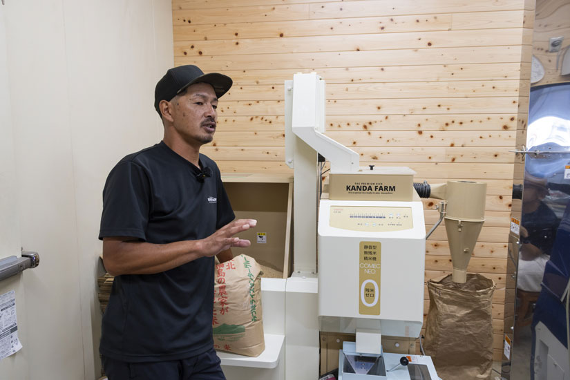 Mr. Kanda is currently conducting as many as 30 test cultivation patterns and is very particular about rice milling. He says that normally, rice would be cleaned by passing it through a color sorter multiple times, but because he does not want to damage the rice, he only passes it through the machine once to judge it strictly. By setting the machine’s line strictly, he is able to remove “cloudy white,” which is a milky white color among normally clear rice grains, and “belly white,” which is a cloudy white color on the belly of the grains, resulting in delicious rice with no cloying taste. Cloudy white and white belly grains do not cause taste problems when eaten, but they are caused by weather conditions (high temperatures, lack of sunlight, etc.) during growth, which are considered insufficient starch in the rice and cause the rice to become soft.