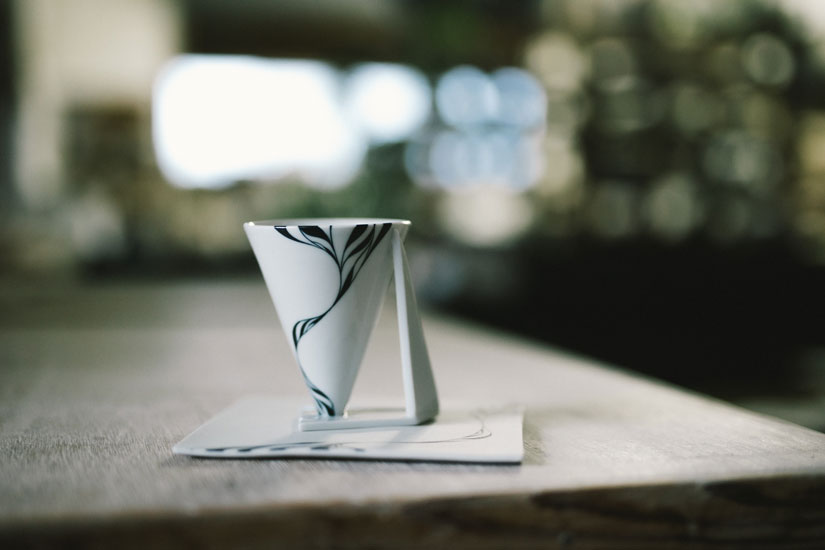 His use of color is also characteristic. While white porcelain and indigo or blue are often associated with Tobe ware, Yamamoto’s etude patterns are unified with black gosu, which has a strong black coloring. This creates a contemporary and tightened look. The glaze is applied thinly. Unlike the heavy weight of Tobe ware, the practical aim is to make it as light as possible as a tool to be used in the hand, and the effect is to clearly show the border between black and white, a characteristic of Yamamoto’s design.