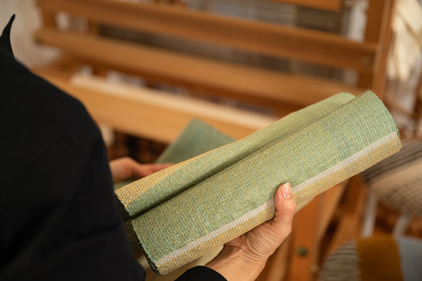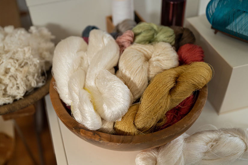 Nakano’s workshop produces a wide variety of cocoons, from ultra-fine yarns to extra-thick yarns suitable for thicker fabrics such as tapestries, and by taking advantage of the characteristics of cocoons, she produces threads of various cilia (ratio of length to weight, which indicates the thickness of a fiber or thread) and textures.