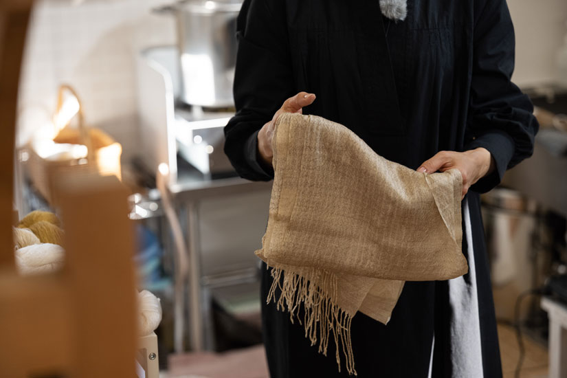 He said, “There is something special about the fluffy, smooth, airy, and uniquely supple texture of textiles made from threads drawn by hand while slowly turning them with a wooden tool.
