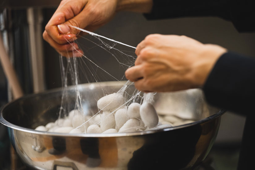 In the usual process of making yarns, thin yarns are first made and then twisted together to the desired thickness, but Nakano decides on the thickness of the yarn from the beginning and adjusts it directly from the cocoon to suit the purpose while feeling the thickness of the yarn with his fingertips.