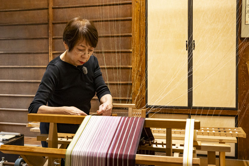 When Tsukiji weaves Kokura-ori on her loom, it’s not a light “tick-tock” sound that resonates, but a loud “thud-thud!”It’s a surprisingly intense sound, hard to imagine coming from such a delicately beautiful fabric. “I weave with strong force to increase the thread density. If I weave gently, the fabric becomes fluffy and lacks firmness. If I slack off, irregularities in the weave become noticeable. So once I start weaving, I just focus intently and keep going.”
